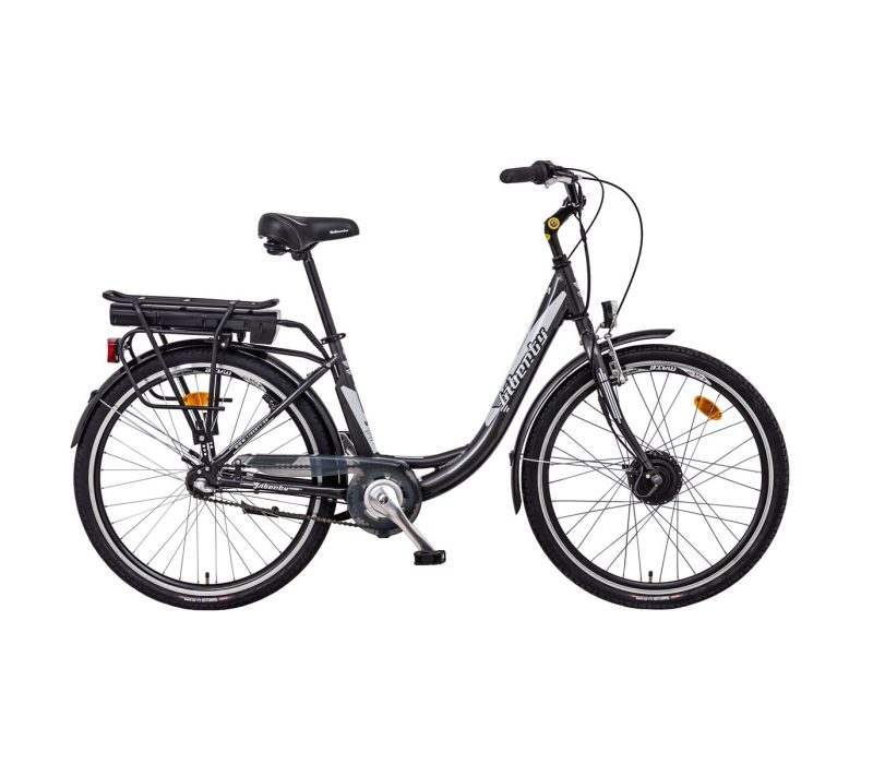 | Elektrický mestský bicykel veľkosti 26″ v šesťrýchlostnom prevedení, s motorom v zadnom náboji, základným akumulátorom 36V/10,4Ah v zadnom nosiči, LCD displejom, tromi stupňami podpory a kompletnou výbavou pre cestnú premávku. Bicykel vyhovuje norme STN EN 15 194: 2017, tzn. že je možné ho prevádzkovať na pozemných komunikáciach bez potreby vodičského oprávnenia a akýchkoľvek iných dokladov. |